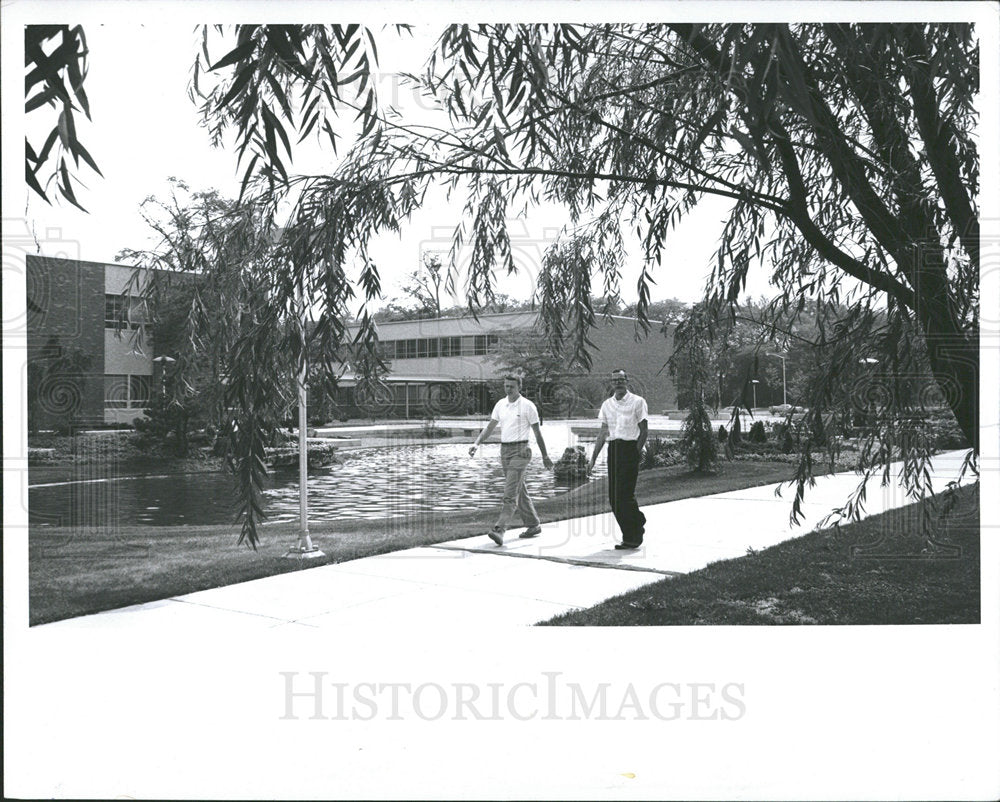 Grouped around a shimmering pool the buildings of the University of Michigan Dearborn are the Center house (left), faculty offices (background), classrooms and administrative offices