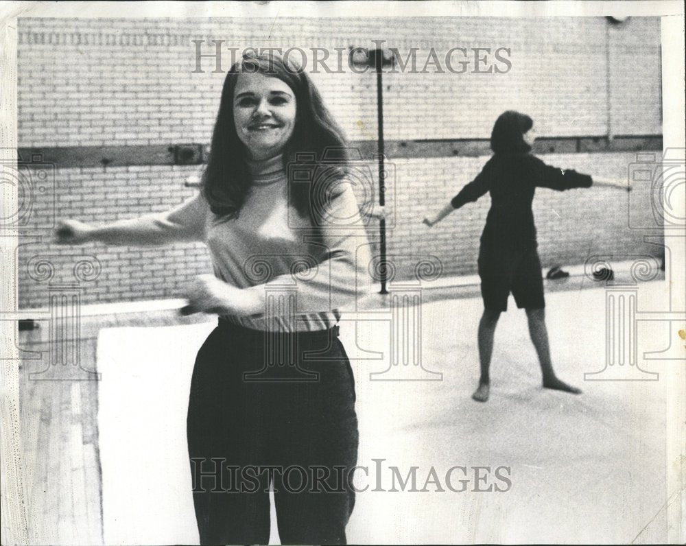 Limbering up with calisthenics are Judy hatch (L) and Judy Hamman stretching at judo self defense course.