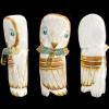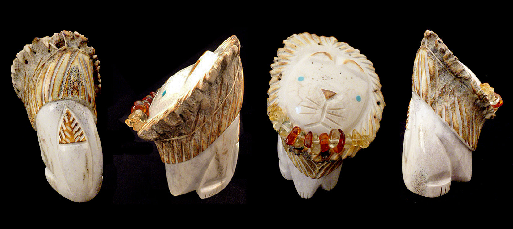 A fantastic cream and gray colored antler African lion with turquoise inlaid eyes, burnished snout, ears, mane and burr carved by Robert Michael Weahkee. Robert has added a necklace just below the face carved in low relief – utilizing amber,,citrine and clear quartz beads. The African lion is an emblem of royalty, strength, conquest, valor, pride, wisdom, authority, courage and protection.