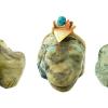 A plump cream, sage and olive green lacy serpentine frog carved by Debra Gasper & Ray Tsethlikai with raised eye sockets and turquoise inlaid eyes. Frogs are the result of water so are associated with the prominence of rain & are used to encourage the growth of crops. Zuni believe the frog is a reminder that we are all the same – development wise – we begin as tiny fishlike creatures in the womb then we evolve from swimmers to creatures of the land. The frogs sings its song reminding us of our watery beginning.