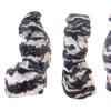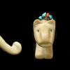 A dark maroon, brown umber and white spotted wild horse rock wolf with turquoise inlaid eyes carved by Andres Lementino – delivered to Sunshine Studio in June of 2024. Andres has added a small heart line on the wolf’s left side featuring small additions of apple coral and gold-lip strips with a point created from a small bit of orange spiny oyster. For the Zuni, the lion represents the guardian of the north – he is the master hunter, revered for intelligence, prowess and strength of will. The mountain lion enjoys the prestige of being one of the most capable predators, and therefore conveys to man a spirit to refine goals, preserve, and achieve.